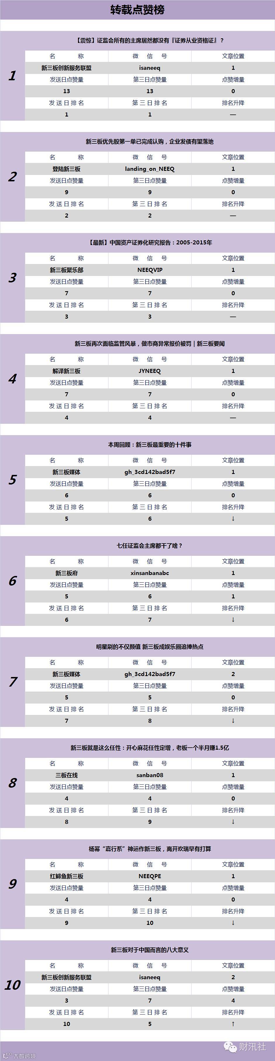 转载点赞榜TOP1被“新三板创新服务联盟”(微信号:isaneeq)的《【震惊】证监会所有的主席居然都没有『证券从业资格证』?》夺得。