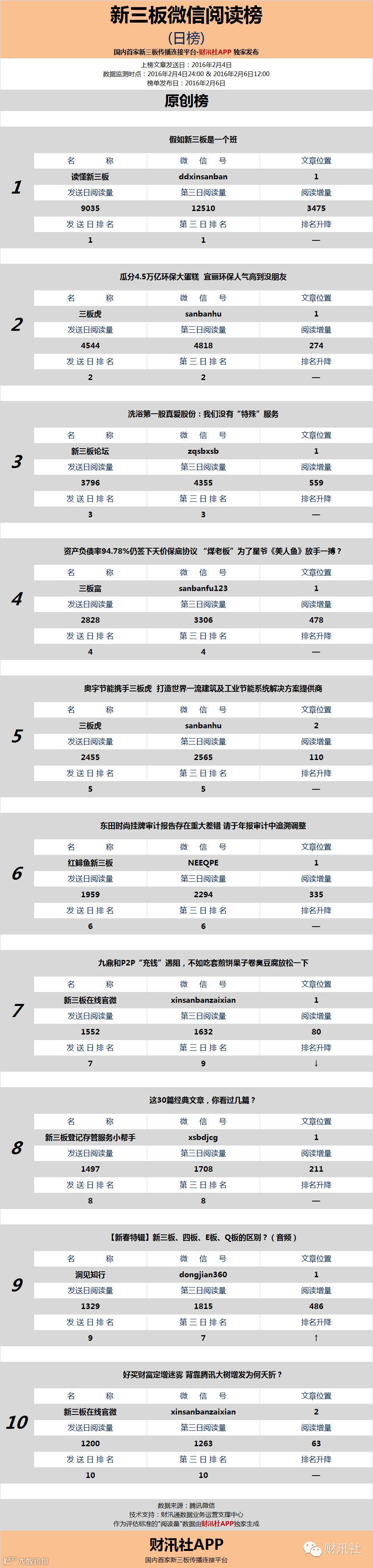 今日《新三板微信阅读榜》(原创榜)文章为上榜公众号于2016年2月4日发送。社掌归纳文章重要信息: