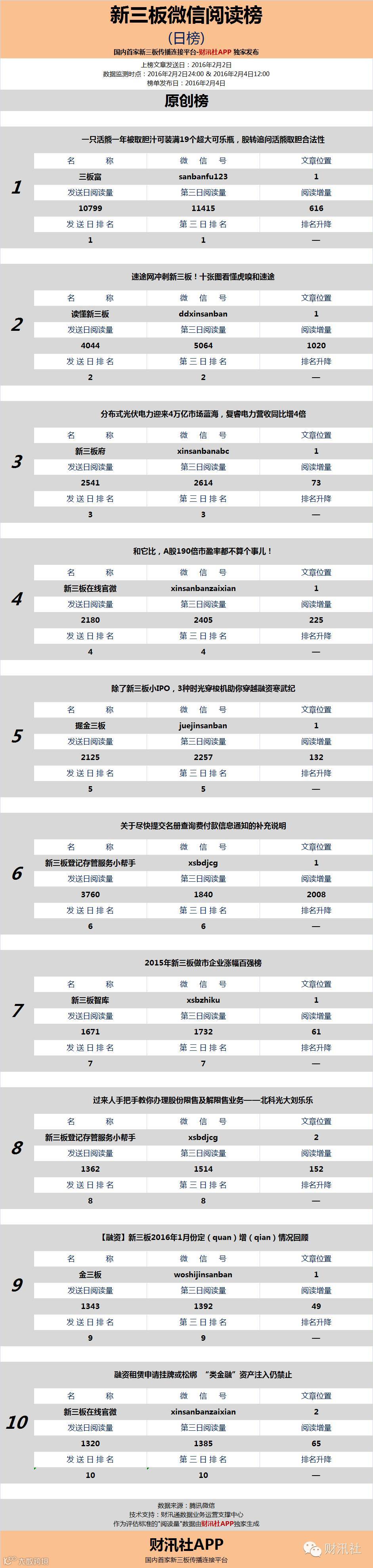 今日《新三板微信阅读榜》(原创榜)文章为上榜公众号于2016年2月2日发送。社掌给各位财迷们归纳文章重要信息: