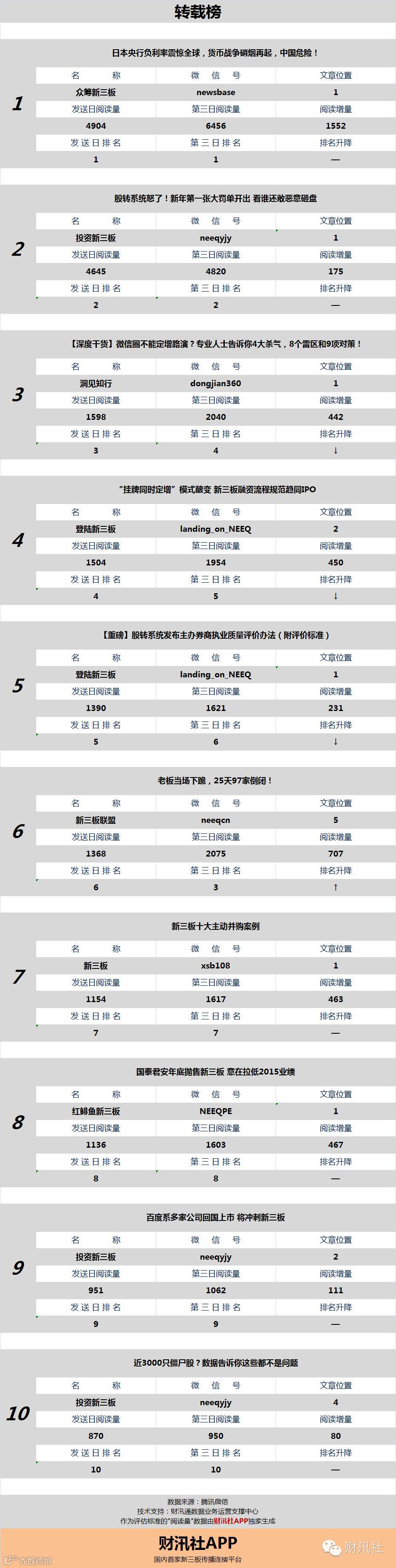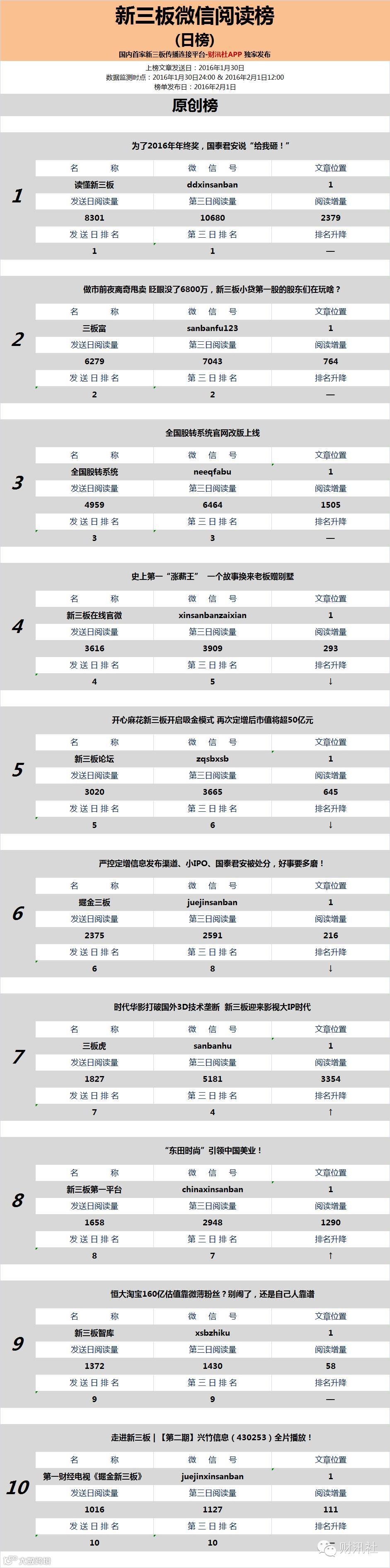 今日《新三板微信阅读榜》文章为上榜公众号于2016年1月30日发送。文章信息摘抄如下: