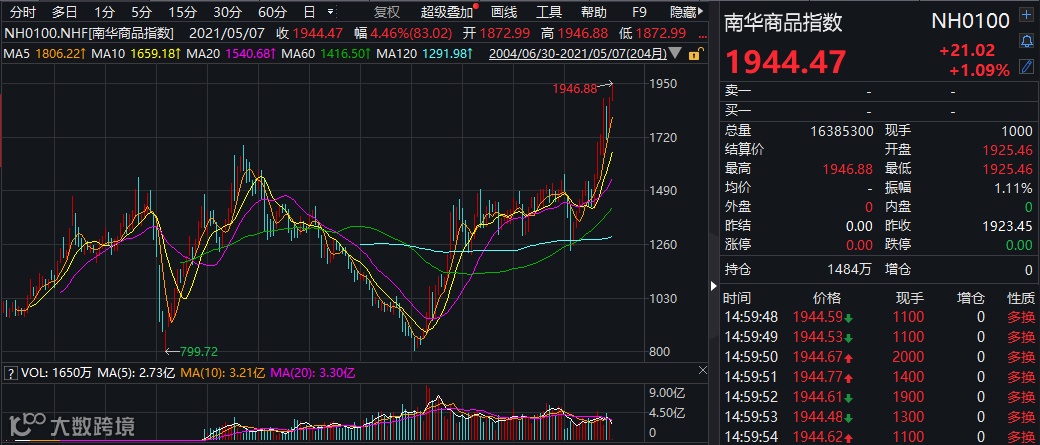 期货市场多个产品继续冲高,伦铜突破10000美元/吨关口创下10年新高。伦铅也乘机上行突破2200美元/吨关口,创下近19个月新高;沪铅主力合约创下近3个月新高。铁矿石、螺纹钢、焦煤、动力煤等全线上扬。南华商品指数已经创出历史新高。