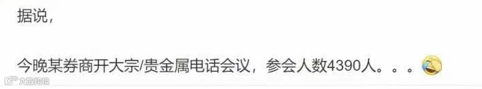 周末,一位投资人在微信上爆料称:某券商大宗/贵金属电话会议参会人数高达4390人。