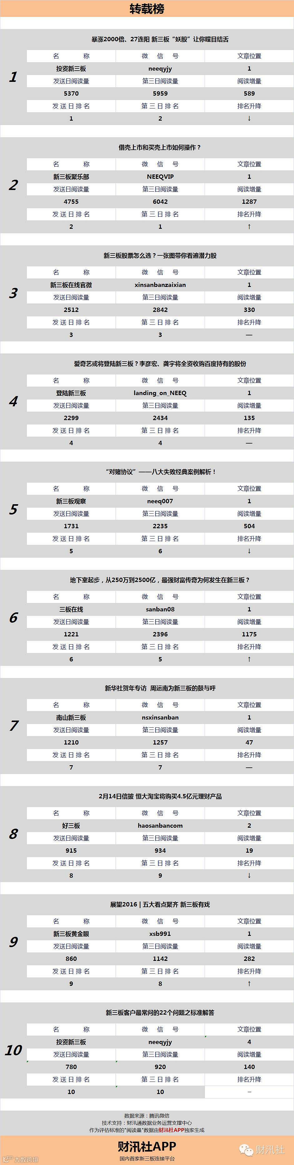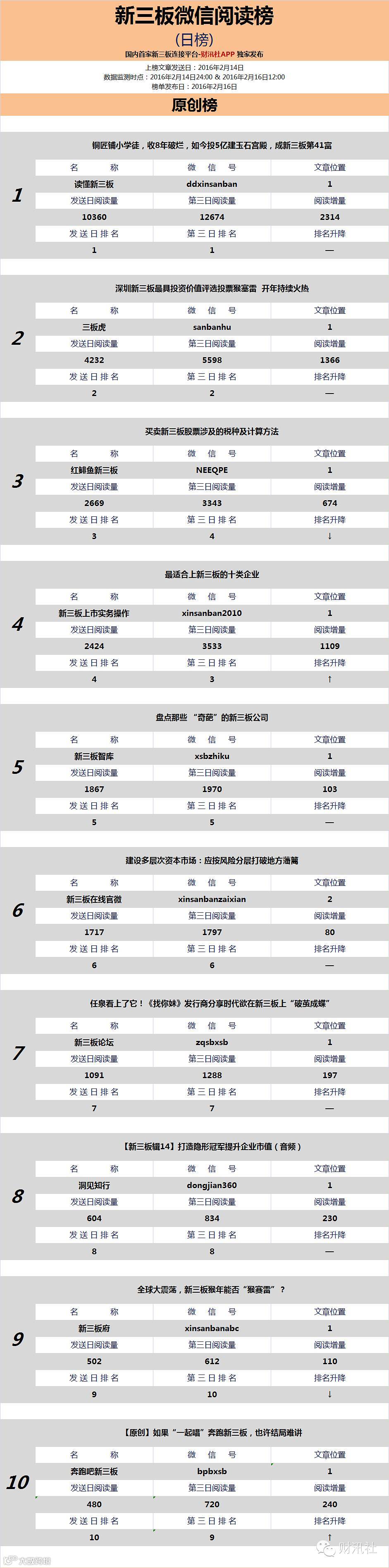 今日《新三板微信阅读榜》文章为上榜公众号于2016年2月14日发送。社掌梳理出以下信息: