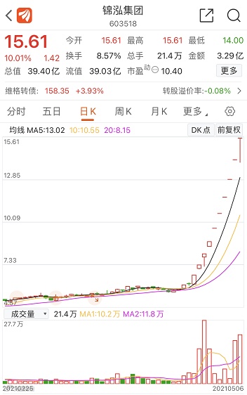 近10个交易日,锦泓集团的股价从6元涨至15.61元/股,市值也从15亿涨至最新的39亿元。也就是说在短短10个交易日里,其市值已上涨了约1.6倍。