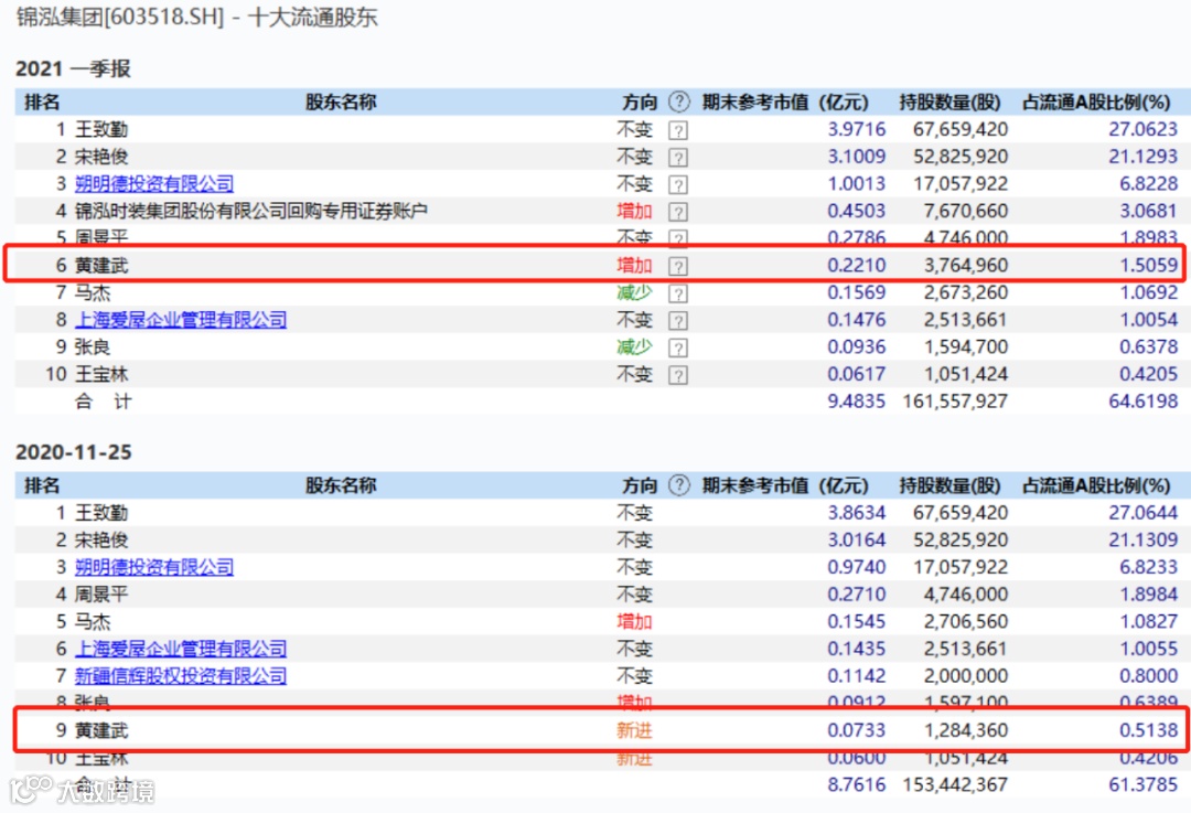 2021年一季报显示,截至3月31日,黄建武已成为锦泓集团第六大股东,持有股份数量为376.5万股,占总股本的比例为1.49%。也就是说,在锦泓集团股价走势平稳的一季度,黄建武已大举加仓。