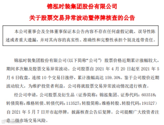 公告还表示,经公司申请,该公司股票“锦泓集团”和包括可转债“维格转债”、转股“维格转股”在内的衍生品自5月7日开市起停牌,披露核查公告后复牌。并称:“公司提醒广大投资者注意二级市场交易风险。”
