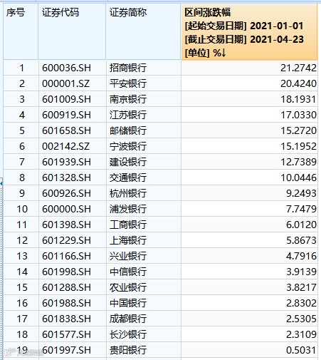 个股方面,年初至今,招商银行和平安银行涨幅超过20%,南京银行、江苏银行、邮储银行、宁波银行涨幅超过15%。