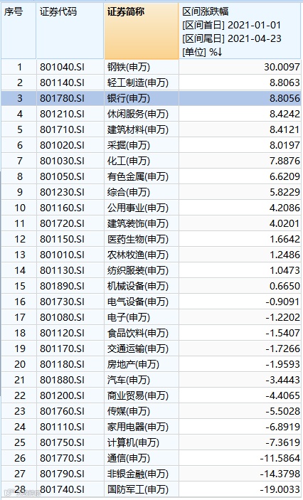 进入2021年以来,银行股成为二级市场宠儿,备受资金青睐。Wind数据显示,年初至今,银行指数大涨8.8%,位居申万28个行业涨幅榜第三。
