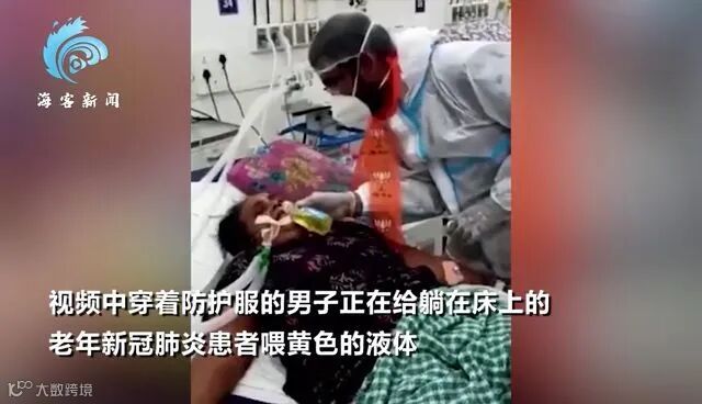 在这段被曝光的视频中,一名全副武装的医护人员,向一名躺在病床上、需要插管助呼吸的老年新冠肺炎患者口中喂下了疑似牛尿的黄色液体。报道称,这段视频由印度人民党在苏拉特的官员基肖尔·宾达发布,标题则显示“工作人员在帮助一名新冠患者”。