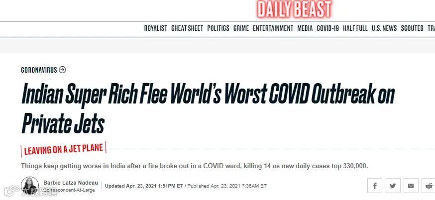 “印度超级富豪乘坐私人飞机逃离世界上新冠疫情最严重的地方”,美国《野兽日报》24日以此为题刊发报道。