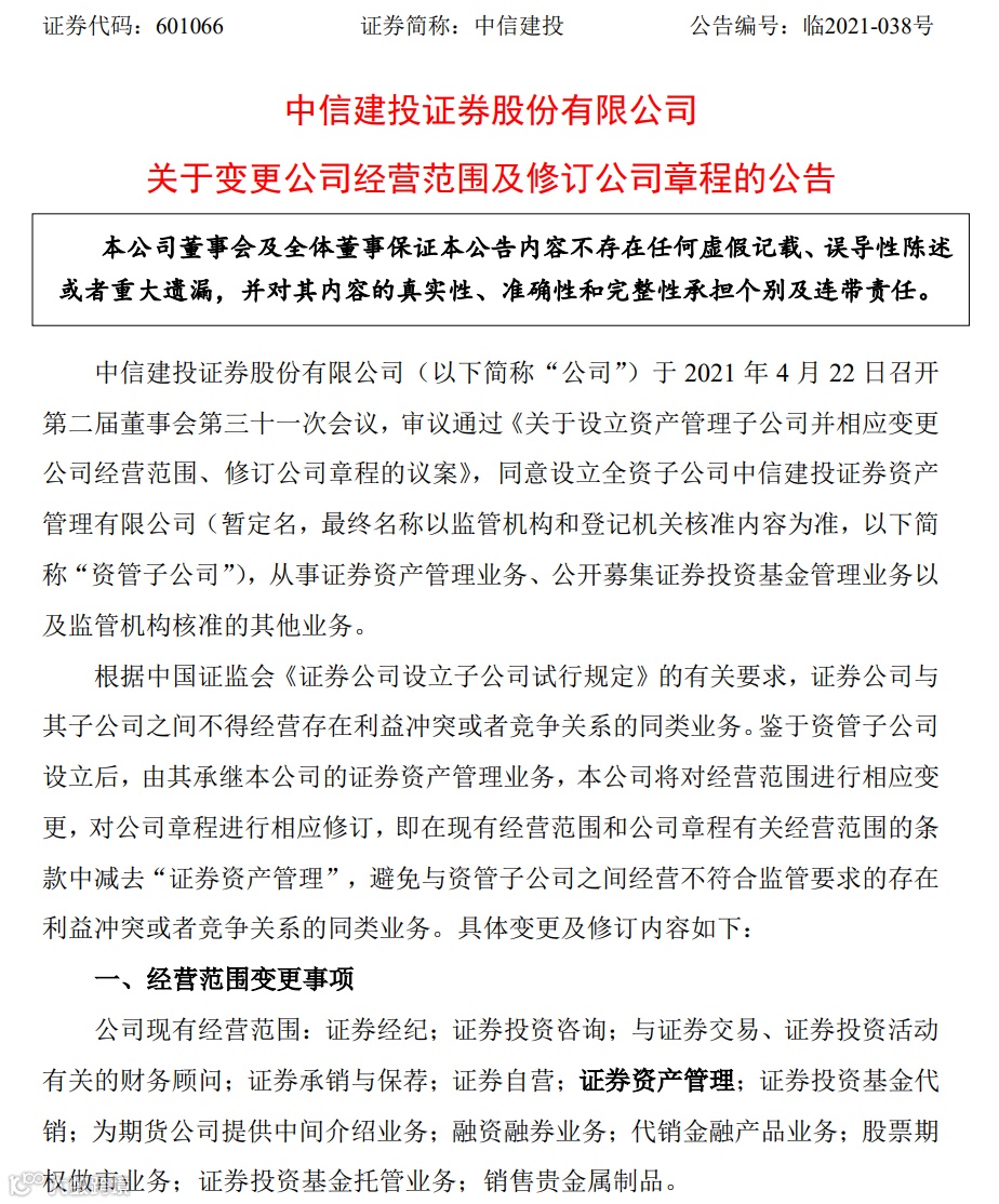 4月22日,中信建投公告称,董事会同意公司出资不超过25亿(含)(其中初始注册资本10亿元)设立全资子公司中信建投证券资产管理有限公司。