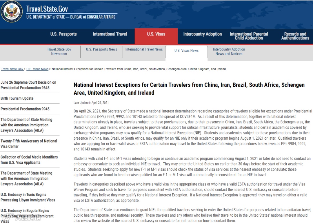 据美国国务院网站,2021年4月26日,国务卿就符合总统公告(PPs)9984、9992和10143的与COVID-19传播相关的例外情况的旅客类别做出了事关国家利益决定。身处中国、伊朗、巴西、南非、申根地区、英国和爱尔兰的记者、学生和某些学术交流访问项目,现在可能有资格申请国家利益例外(NIE)。由于在中国、伊朗、巴西或南非的学生和学者必须遵守这些公告。仅当其学术课程于2021年8月1日或更晚开始时,才有资格获得NIE。即使PP 9984、9992和10143仍然有效,正在申请或持有有效签证或ESTA授权的合格旅行者也可以按照以下程序前往美国。