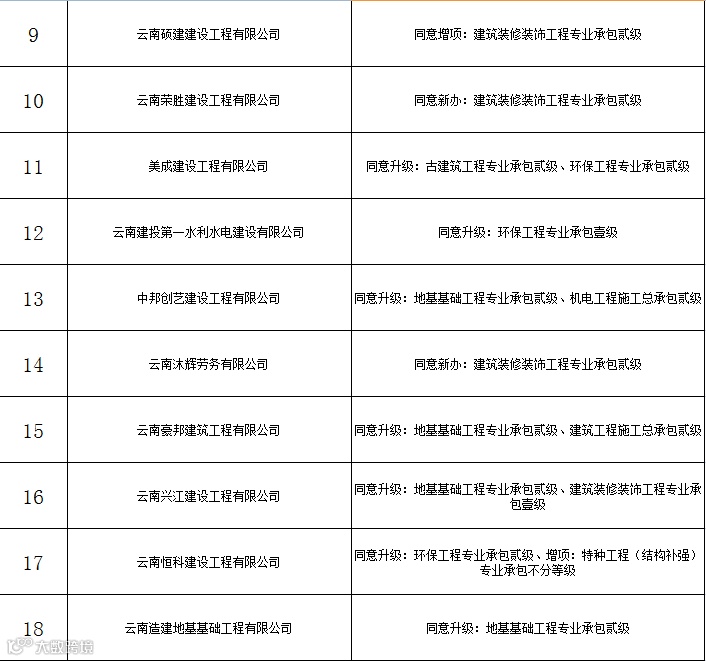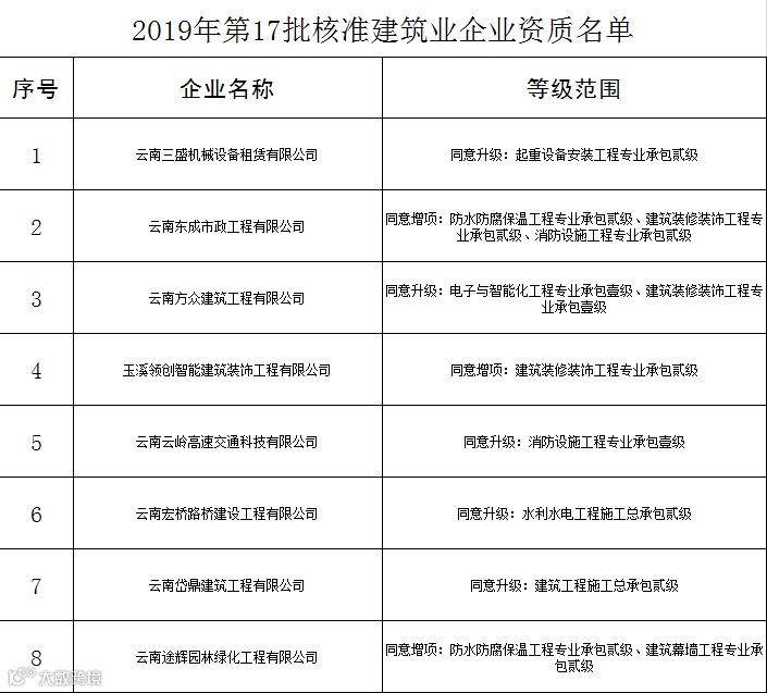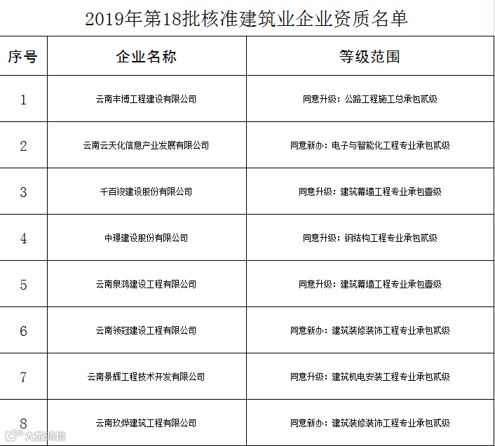 近日,云南省住建厅发布了关于核准2019年第十七、十八和十九批建筑业企业资质名单的公告,总共有97家企业通过核准资质,具体如下。