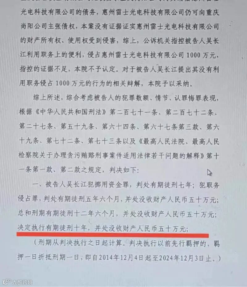 4月29日,惠州市中级人民法院对雷士照明创始人吴长江案重审后作出判决,被告人吴长江犯挪用资金罪、职务侵占罪,决定执行有期徒刑十年。