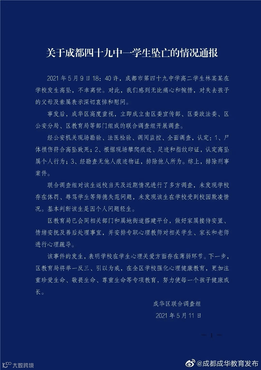5月9日,四川成都市第四十九中学高二学生林某某在学校发生高坠,不幸离世。11日19时,警方发布通报称,排除刑事案件,家属对调查结论无异议。