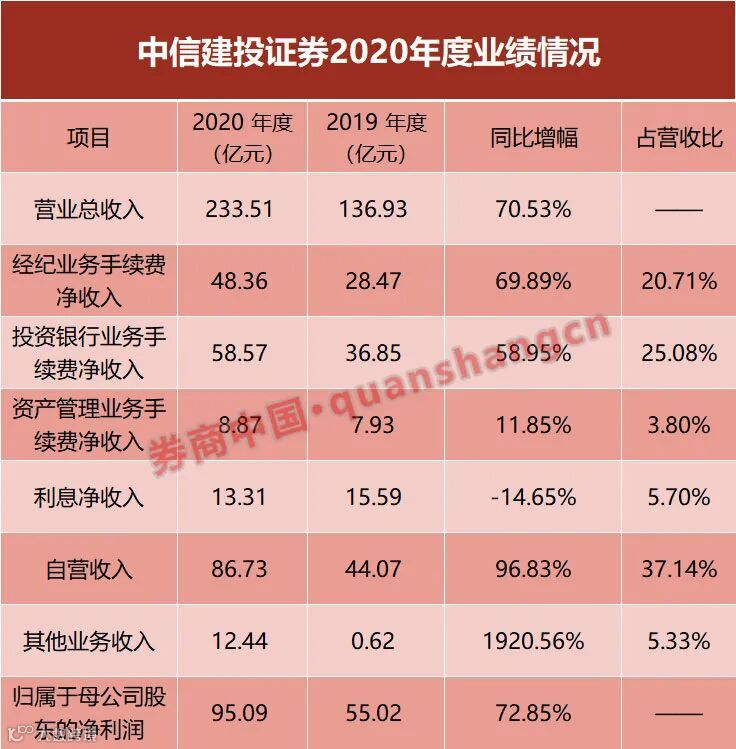 3月31日晚间,中信建投证券披露了2020年年报,全年实现营业收入233.51亿元,同比增长70.53%;归母净利润95.09亿元,同比增长72.85%。此前一天披露年报的中金公司,2020年度实现归母净利润72.08亿元,同比增长70%。它们的利润增速均远超行业平均水平,也是为数不多净利润增速超七成的大型券商。
