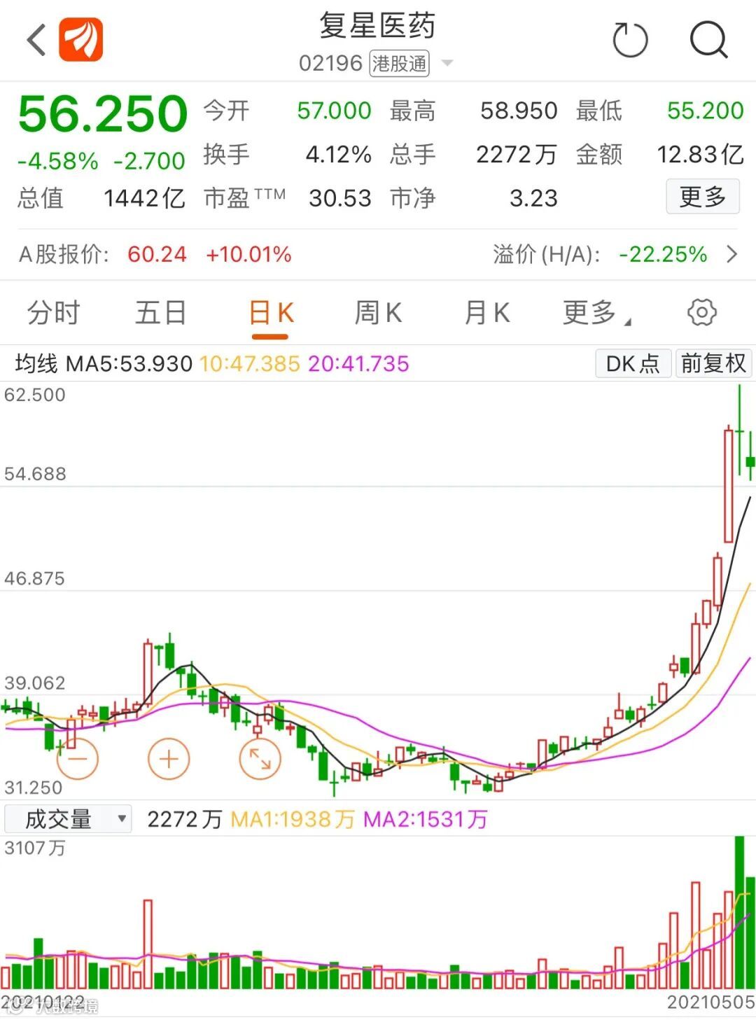 作为辉瑞新冠疫苗的中国引进方,复星医药(02196.HK)股价表现非常强势。5月3日一度飙涨近20%,5月4日盘中一度刷新历史新高62.5港元。截至5日收盘,复星医药最新股价为56.25港元。4月以来,复星医药累计涨幅已接近70%,总市值达到1442亿元。