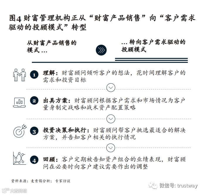 因此,财富管理机构正从“财富产品销售”向“客户需求驱动的投顾模式”转型,由“自有产品销售”向“开放产品平台”转型。