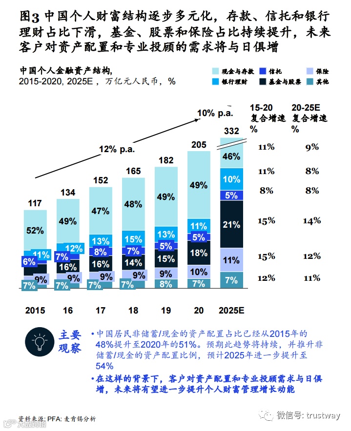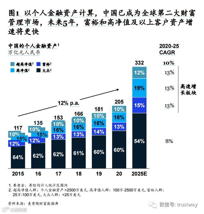 世界级领先的管理咨询公司麦肯锡认为,在居民财富管理需求持续高涨、数字化浪潮强势来袭、行业创新不断涌现的背景下,中国财富管理行业正迈向全新发展阶段:预计未来中国个人金融资产仍将维持10%的增速,2025年这一数字有望达到332万亿。