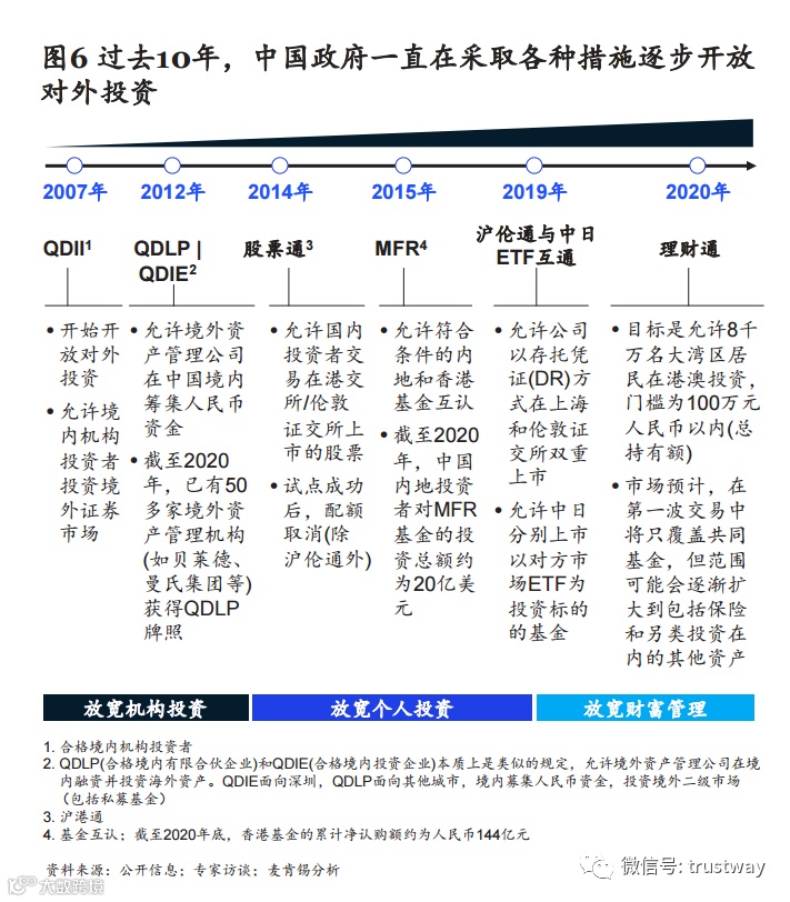 随着国家金融市场双向开放加速,新渠道不断涌现、跨境投资愈加顺畅,跨境业务将在政策东风的鼓励下更加多元化。这包括2007年通过QDII制度允许境内机构投资海外证券市场、2012年开始试点QDLP/QDIE、2014年开启“沪港通”、2015年推出内地与香港互认基金以及2019年开放沪伦通与中日ETF互通。而2020年更是波澜壮阔的一年,自9月重启QDII额度发放以来,国家外汇局已连续三个季度发放QDII额度,预计QDII总额度提升只是时间问题;此外,粤港澳大湾区的跨境理财通试点则是继港股通、沪伦通之后,资本项下互联互通的重要尝试,粤港澳大湾区居民个人未来有望通过“北向通”或“南向通”的形式跨境投资粤港澳大湾区银行理财产品,未来还存在纳入保险产品的可能(见图6)。