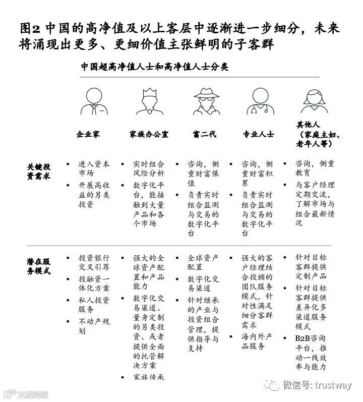 此外,由于年龄、财富来源、风险偏好、投资目标等不同,客层内部需求进一步分化。以超高净值和高净值客层为例,麦肯锡认为市场上已涌现出企业家、家族办公室客户、富二代、专业人士等价值主张鲜明的子客群(见图2),他们在稀有产品、跨境投资机会、附加增值服务等方面均有独特需求。但目前国内鲜有机构能够真正做到差异化服务。一方面由于对客群的细分颗粒度不够,另一方面因为机构针对不同客群缺乏明确价值主张及客制化产品和服务方案。面向未来,如何细分经营、重点聚焦,将是财富管理机构需要考虑的关键问题。