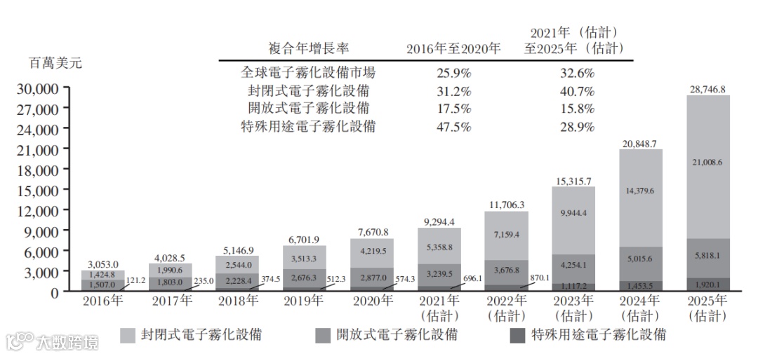 据弗若斯特沙利文于2021年3月出具的独立市场研究报告,全球电子雾化设备市场规模按出厂价格计算,从2016年到2020年期间的复合增长率约为25.9%。