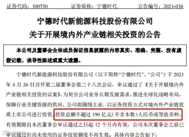 宁德时代公告称,为契合公司业务长期发展需求,推进全球化战略布局,保障行业关键资源的供应,公司拟围绕主业,以证券投资方式对境内外产业链优质上市公司进行投资,投资总额不超过190亿元或等值币种。