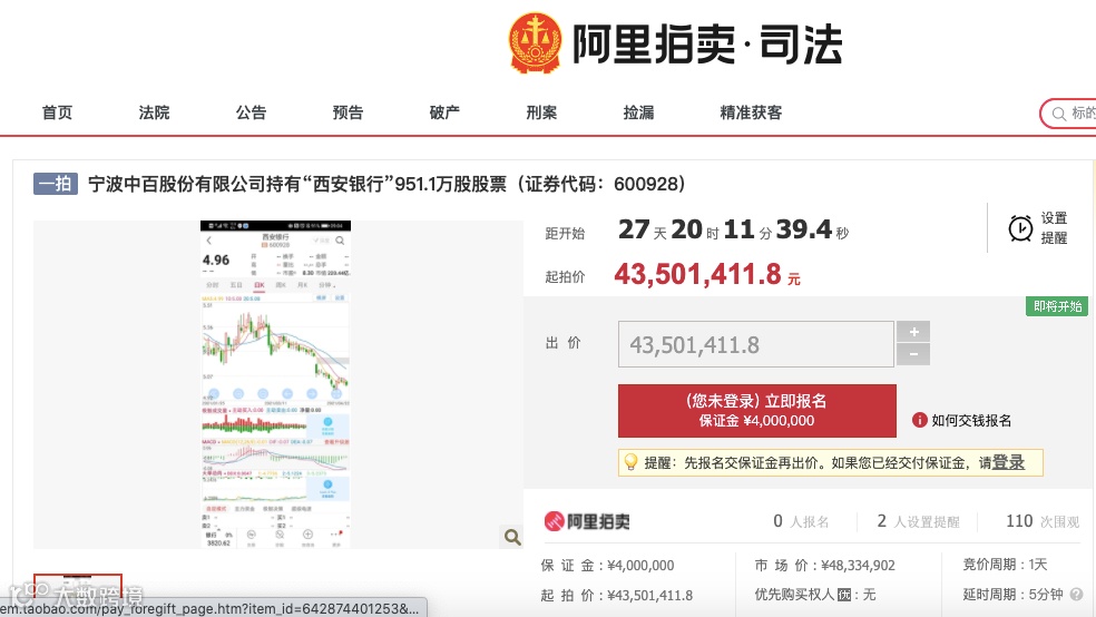 根据已执行的“中国建筑第四工程局有限公司与宁波中百股份有限公司仲裁案”的执行要求,宁波中百持有的西安银行9511万股股票已被法院冻结,将根据申请执行人中建四局的申请,拆分为十等份在淘宝网进行司法拍卖,即每份951.1万股。