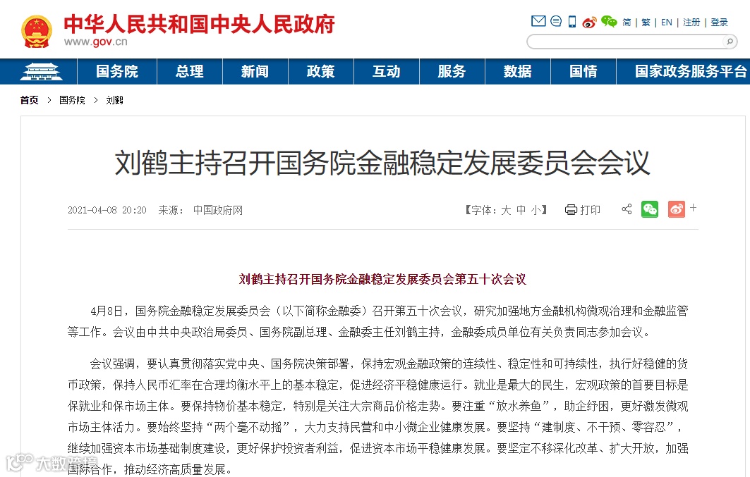 据中国政府网消息,4月8日,国务院金融稳定发展委员会(以下简称金融委)召开第五十次会议。此次会议的主题是研究加强地方金融机构微观治理和金融监管等工作。会议由中共中央政治局委员、国务院副总理、金融委主任刘鹤主持,金融委成员单位有关负责同志参加会议。