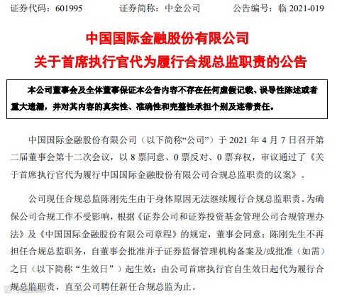 4月7日晚间,中金公司披露的临时公告引发行业关注,公司合规总监陈刚因身体原因无法继续履职,中金公司CEO将代为履行合规总监职责。