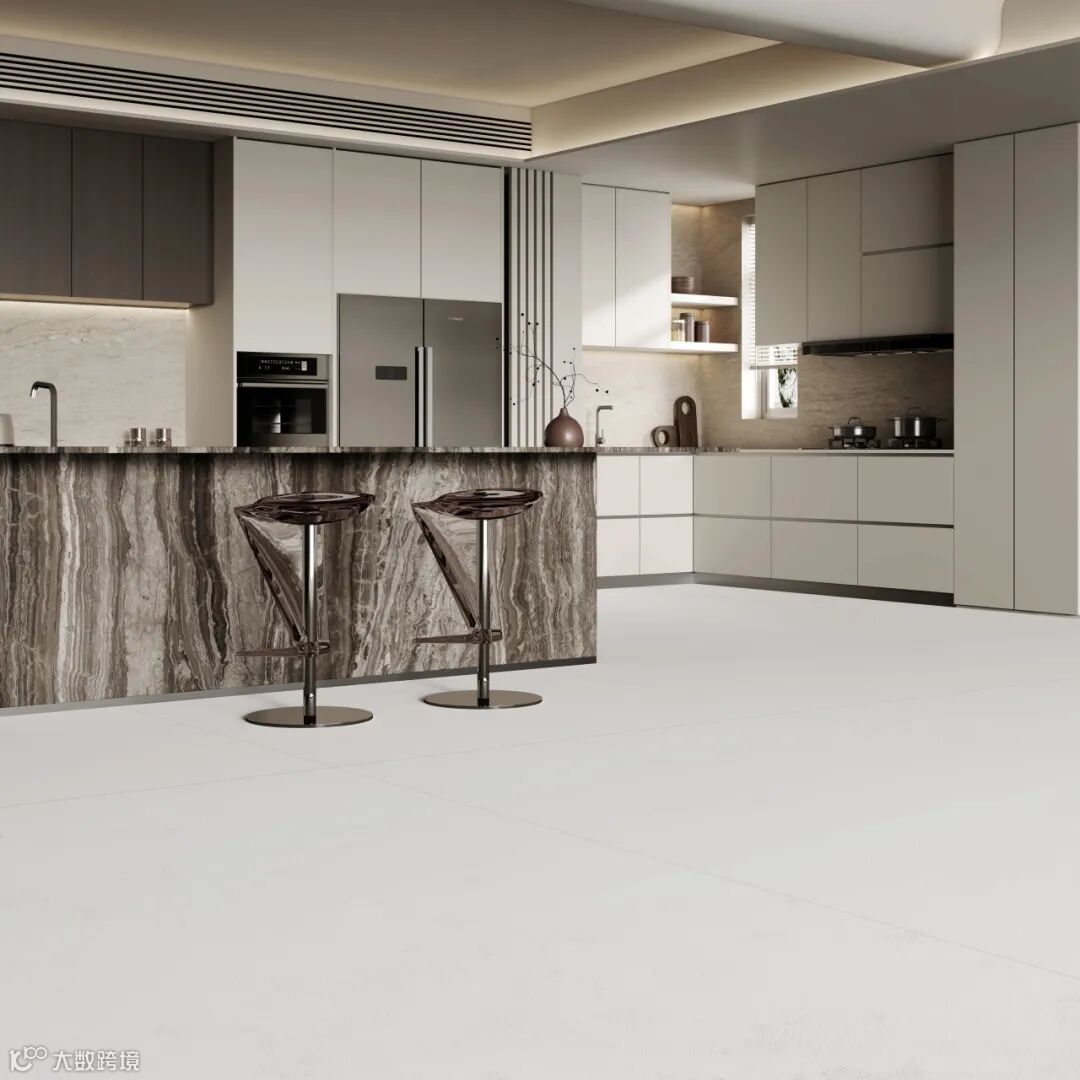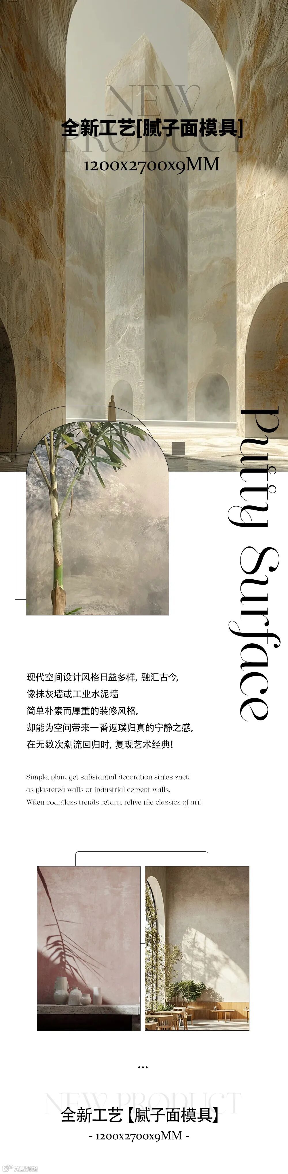 1200x2700x9mm适用于墙面/地面等多场景应用,腻子面模具岩板,完美适配侘寂风、极简工业风、新中式等多元设计风格。
