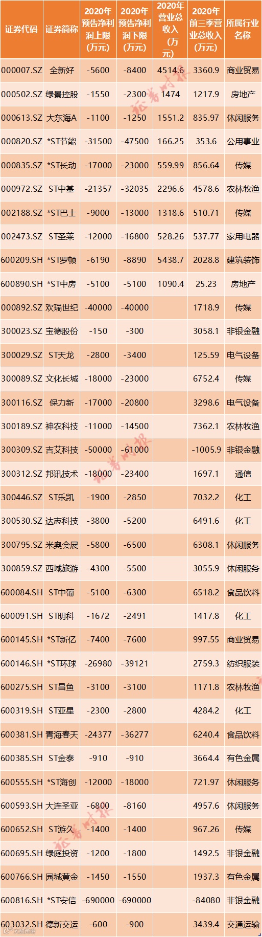 记者梳理发现,目前,在2020年业绩预告中已披露营业总收入的公司中,全新好、绿景控股、大东海A等10家公司或将被实施退市风险警示。值得注意的是,新规下,市场或将首度出现连续两年被“*ST”的企业,其中*ST节能、*ST长动、*ST巴士、*ST罗顿、*ST中房均在其中。