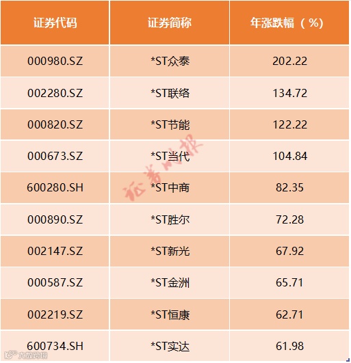 年初以来,126家ST股股价上涨,其中涨幅最高的为*ST众泰,涨幅为202.22%,其次是*ST联络、*ST节能、*ST当代,涨幅均超过100%,分别为134.72 %、122.22%、104.84%。