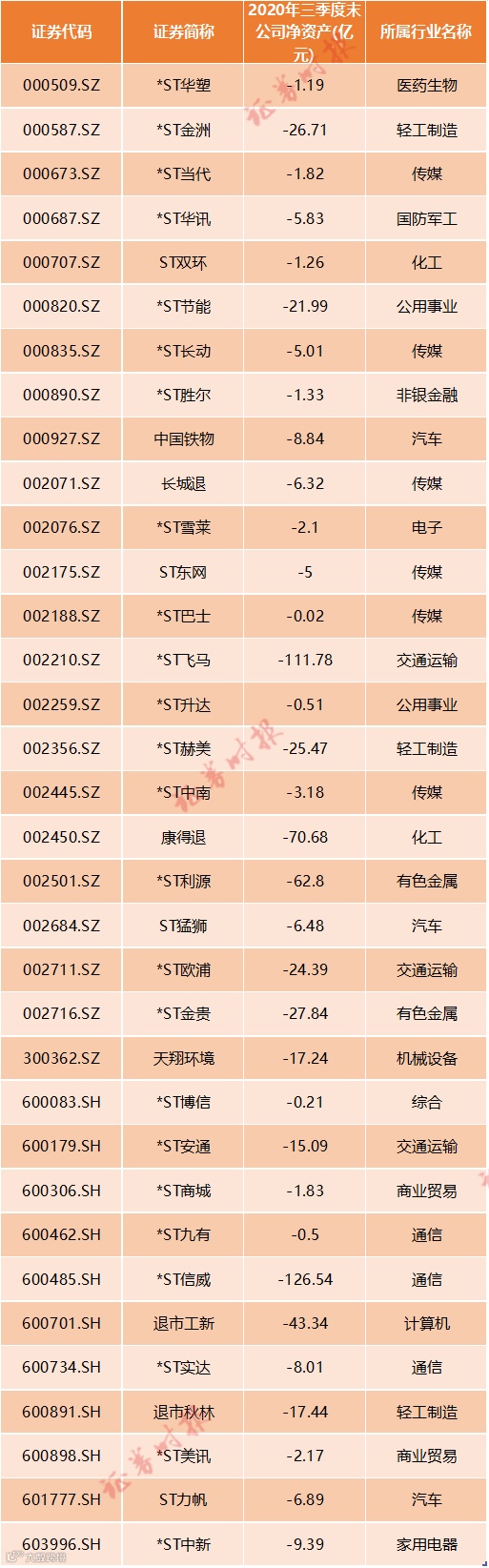 Wind数据显示,截至2020年三季度末,共有34家上市公司净资产为负值,除长城退、康德退、退市工新、退市秋林外,大部分公司均已“戴帽”:或被实施退市风险警示(*ST)、被实施其他风险警示(ST)。目前来看,中国铁物、天翔环境或将被实施退市风险警示。