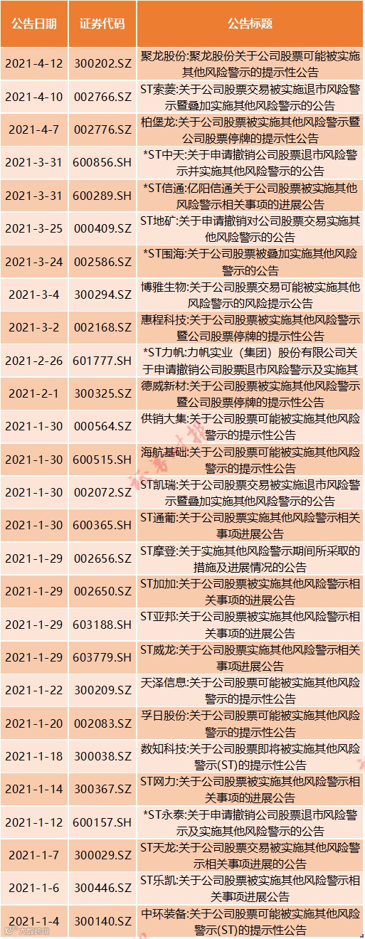 2021年以来,中环装备、ST乐凯、ST天龙等27家公司发布可能被实施其他风险警示的提示性公告。
