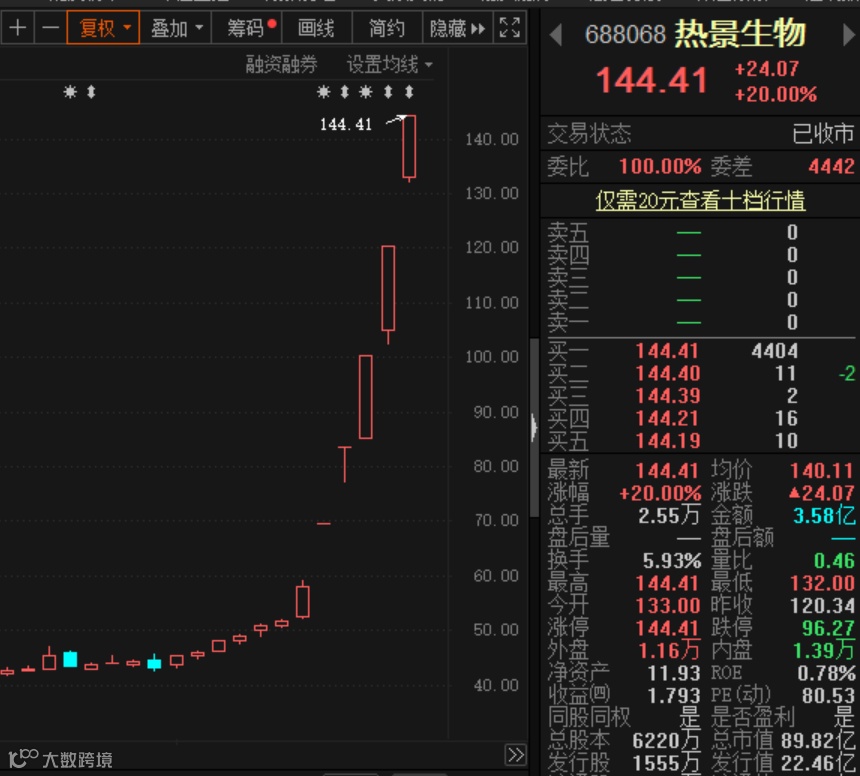 4月19日晚间,已连续五个涨停(20%涨跌幅)的科创板牛股热景生物(688068)再发股票异动暨风险提示公告。
