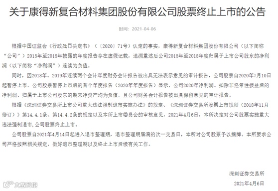 4月6日,深交所发布关于康得新复合材料集团股份有限公司股票终止上市的公告。