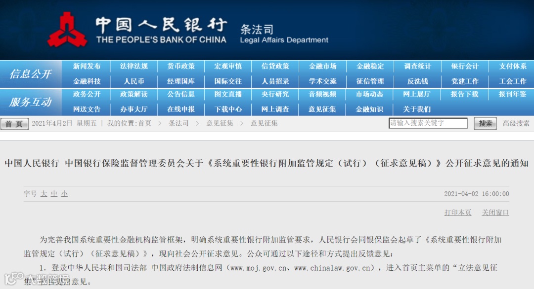 4月2日,央行、银保监会发布《系统重要性银行附加监管规定(试行)(征求意见稿)》,这是继今年年初起正式实施《系统重要性银行评估办法》后(详情请看《超重磅!中国版系统重要性银行新规来了,明年正式实施!哪些银行有望上榜?如何改变行业生态?》),借鉴国际监管经验,进一步明确系统重要性银行的附加监管要求。
