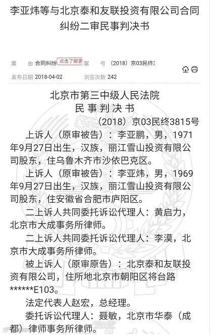 在中国裁判文书网上,证券时报记者搜索与此案有关的终审裁判书,系李亚鹏、其兄李亚炜与北京泰和友联投资有限公司的两份民事二审判决书,案由均为合同纠纷,判决日期发别为2017年1月17日和2018年3月23日。