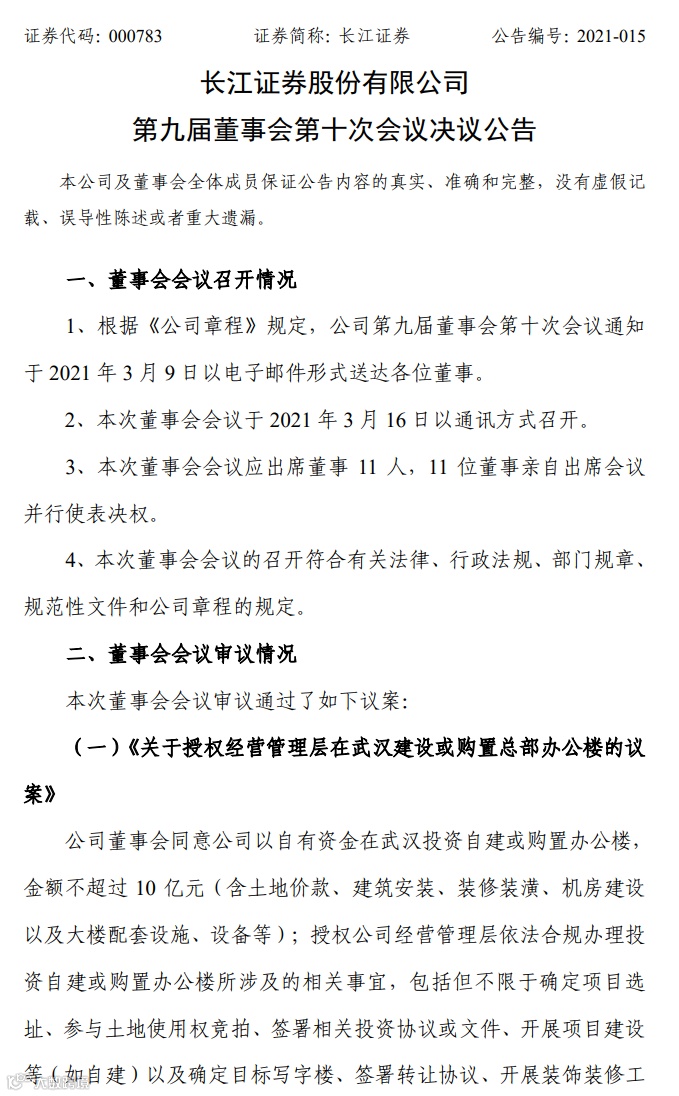 3月16日晚间,长江证券披露,董事会同意该公司以自有资金在武汉投资自建或购置办公楼,金额不超过10亿元(含土地价款、建筑安装、装修装潢、机房建设以及大楼配套设施、设备等)。