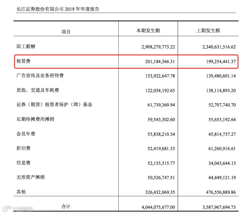 其中,2018年业务及管理费用中,租赁费用达到1.99亿元,仅次于第一位的员工薪酬费用23.4亿元。2019年也类似,业务及管理费合计40.44元,其中,租赁费用2.01亿元,同比保持增长。