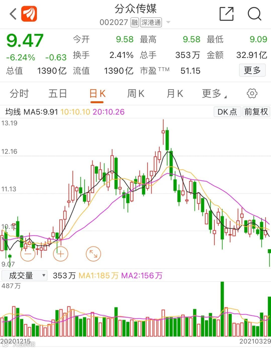 传媒娱乐板块大幅走低,分众传媒低开5%,随后更快速闪崩逼近跌停,成交额快速放大。其后买盘入场,股价逐步收复失地。截至29日收盘,分众传媒收报9.47元,下跌超6%,最新市值1390亿元。