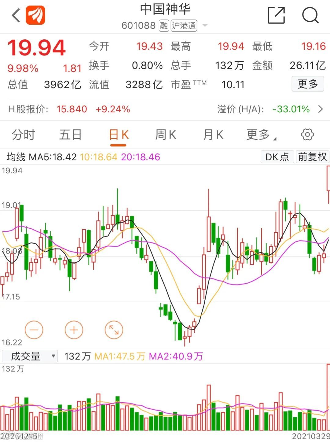 3月29日中国神华AH股同步大涨,A股收盘封涨停板报19.94元,H股涨幅扩大至近10%。中国神华也带动整个煤炭板块集体走强。兖州煤业逼近涨停,开滦股份、恒源煤电、陕西煤业等纷纷跟涨。