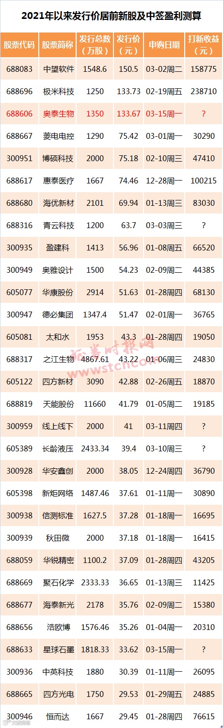 在上述新股中,周一申购的奥泰生物颇为引人注目。资料显示,该股发行价为133.67元,仅次于中望软件和极米科技,为年内第三高。