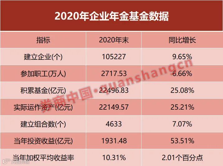 2020年底,企业年金积累基金规模2.25万亿,实际运作资产2.21万亿,同比均增超25%。2020年,企业年金基金的投资收益达到1931亿元,同比大幅增长53.51%;平均收益率10.31%,同比提升2.01个百分点。