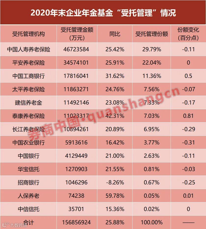 2020年末,国寿养老受托管理企业年金规模4672亿,同比增长25.42%,市场份额29.79%;平安养老受托管理规模3457亿,同比增长25.91%,份额22.04%;工行管理规模1781亿,同比增长31.62%,超越了年金受托管理业务的整体增幅,受托管理市场份额11.36%,提升了0.5个百分点。