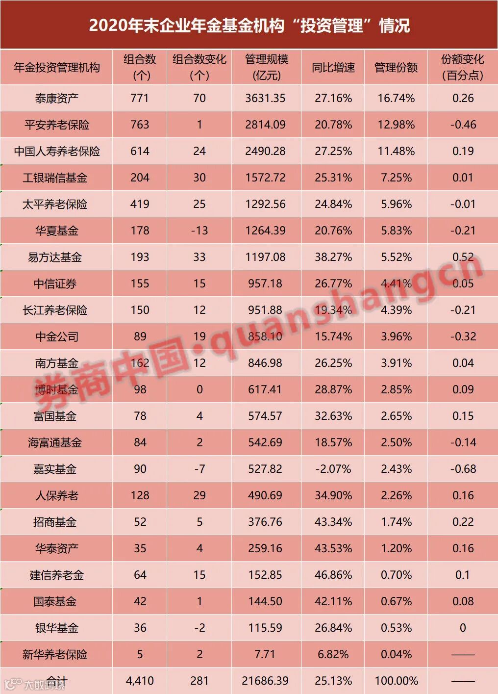 截至2020年底,企业年金投资管理业务规模2.17万亿,同比增长25.13%。22家投管人的投资管理规模,除嘉实基金外,也均实现不小增长。叠加基数较小等因素,4家机构的管理规模增长超过40%,包括:建信养老金、华泰资产、招商基金、国泰基金。