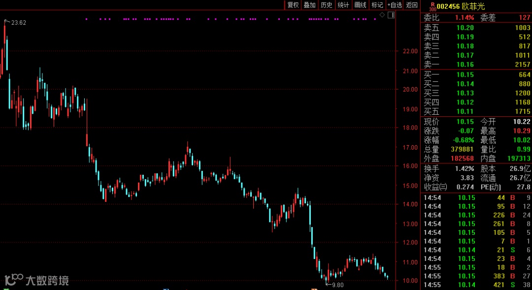 市场影响来看,欧菲光被苹果剔除出供应链之传闻,已着实对公司股价产生了影响。记者统计发现,去年9月1日至今,欧菲光股价已整体下跌46.29%,市值也已蒸发超200亿元,而去年7月股价高点23.62元/股至今,其股价已整体下跌54.03%。