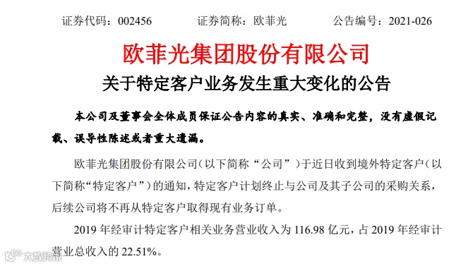 3月16日,欧菲光公告,公司于近日收到境外特定客户(下称“特定客户”)的通知,特定客户计划终止与公司及其子公司的采购关系,后续公司将不再从特定客户取得现有业务订单。2019年经审计特定客户相关业务营业收入为116.98亿元,占2019年经审计营业总收入的22.51%。