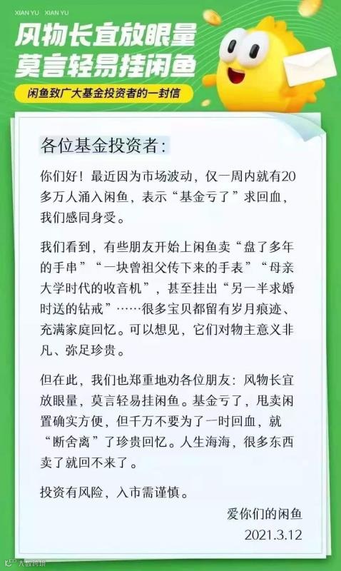 闲鱼平台表示,许多出售的闲置物品有着对物主非凡的珍贵意义。“风物长宜放眼量,莫言轻易挂闲鱼”,闲鱼平台在信中奉劝投资者,千万不要为了一时回血,就“断舍离”了珍贵回忆。在这份信的末尾,闲鱼意味深长的警示:“投资有风险,入市需谨慎”。